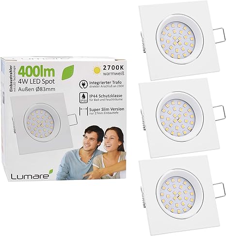 3x lumare led einbaustrahler 4w 400 lumen ip44 nur 27mm extra flach einbautiefe led leuchtmodul austauschbar deckenspot ac 230v 120 deckenlampe einbauspot warmweiss weiss eckig badezimmer amazon de beleuchtung