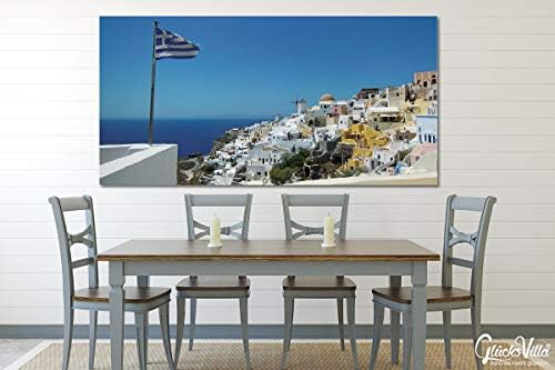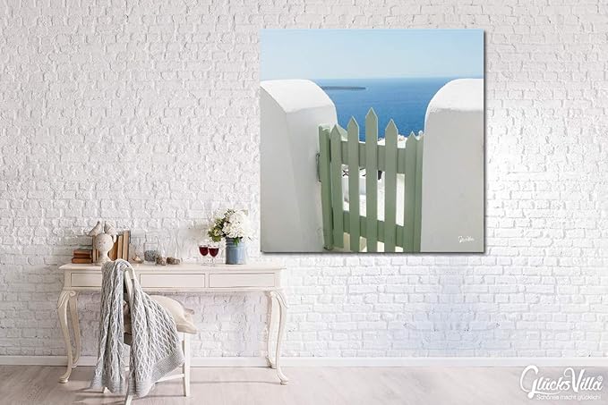 glucksvilla santorin du perle 21 xxl bild wandbild grosse 60 x 60 cm quadrat druck auf art canvas leinwand keilrahmen 2 cm griechenland agais meer insel zaun grun turkis blau liebe gross