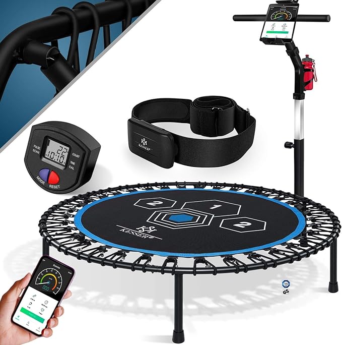 kesser smart fitness trampolin ft x990 inkl pulsgurt tuv gs sprungzahler app klappbar haltegriff verstellbar handy flaschenhalterung leise bis 150 kg sport aerobic und jumping blau amazon de sport freizeit